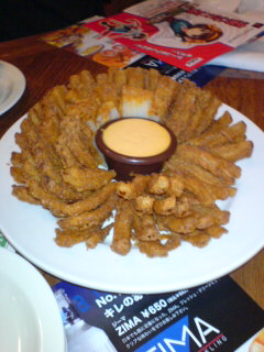 野郎3人、タマネギと格闘す。 日常 2007/09/23 本日の東京ゲームショウの帰りに、PSU/PSO方面の知り合いと一緒に食事をしにアウトバック幕張店に行ってました。 そして、メニューに知り合いのブログで写真を見た「お皿いっぱいのタマネギの揚げ物」を発見したので3人でタマネギ一皿と各自でパスタを一皿注文。 …全般的に高めの価格設定でしたが、価格相当のヘヴィな満腹感を得られました(笑